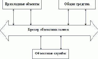 Согласованная с архитектурой OMA прикладная информационная система представляется как совокупность классов и экземпляров объектов, которые взаимодействуют при поддержке брокера объектных заявок (ORB - Object Request Broker). ORB, общие средства (Common Facilities) и объектные службы (Object Services) относятся к категории промежуточного программного обеспечения (middleware) и должны поставляться вместе. Объектные службы представляют собой набор услуг (интерфейсов и объектов), которые обеспечивают выполнение базовых функций, требуемых для реализации прикладных объектов и объектов категории "общие средства" (например, специфицированы служба именования объектов, служба долговременного хранения объектов, служба управления транзакциями и т.д.). Общие средства содержат набор классов и экземпляров объектов, поддерживающих функции, полезные в разных прикладных областях (например, средства поддержки пользовательского интерфейса, средства управления информацией и т.д.).